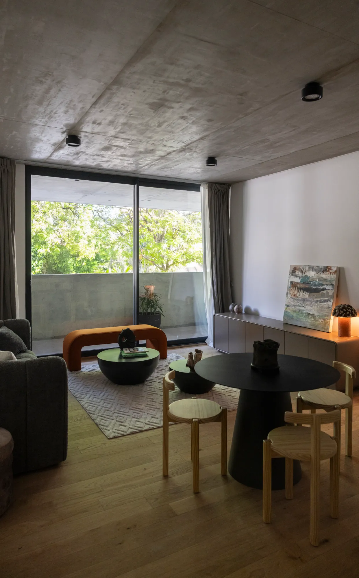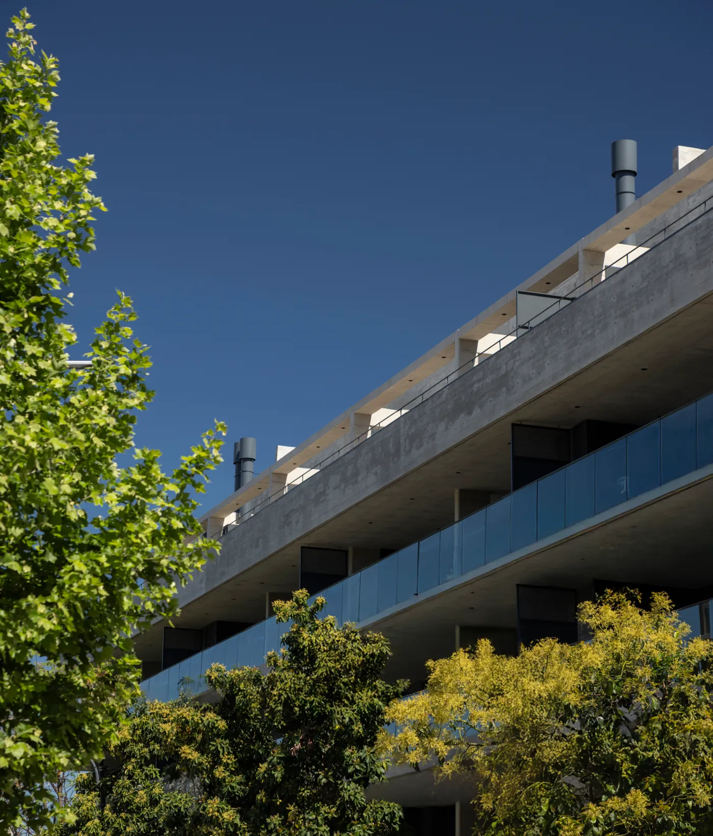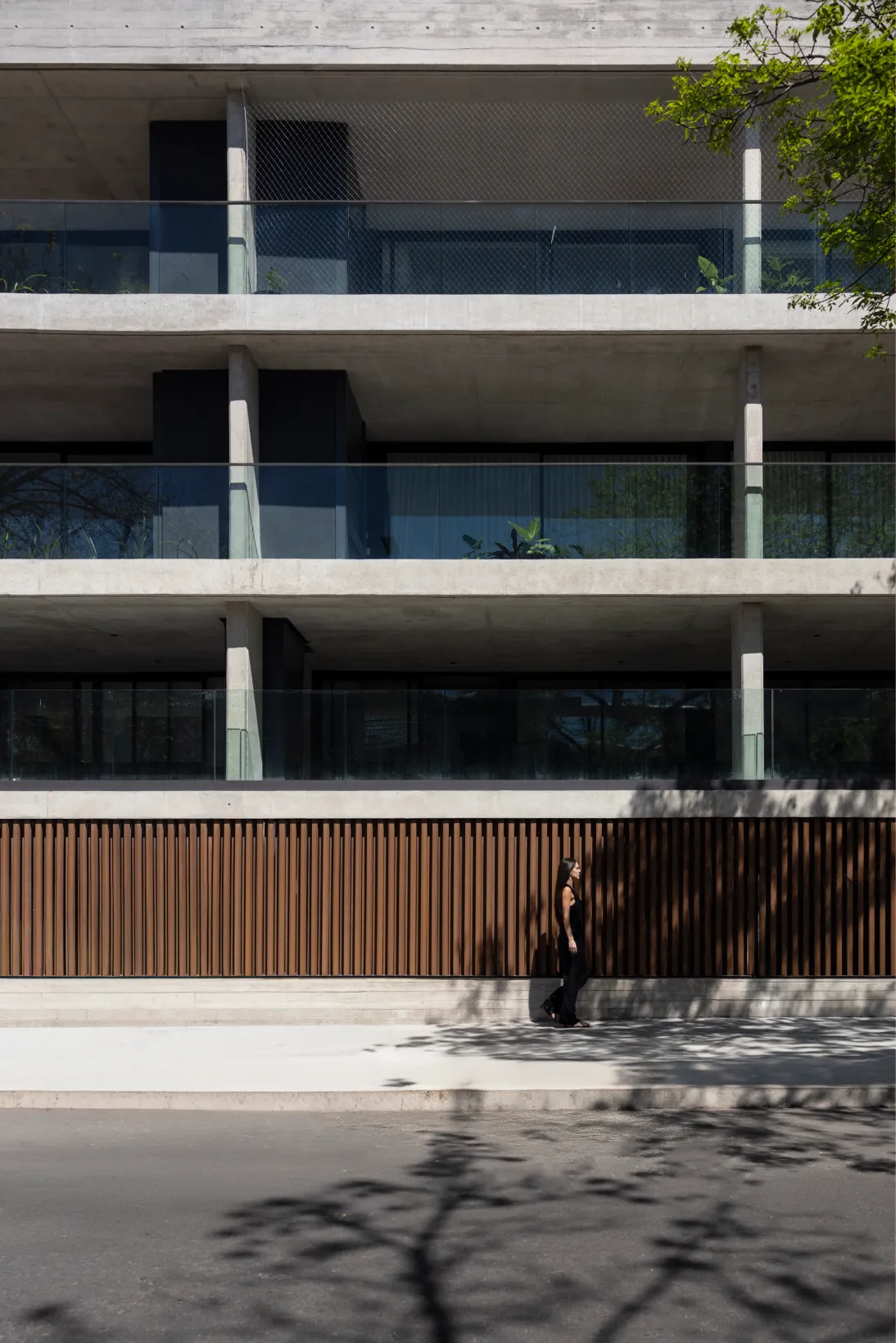 Ubicado en la esquina de Arcos y Correa, en el corazón de Núñez, LOMAS se integra con naturalidad en un entorno residencial de baja escala y veredas arboladas. El edificio se plantea a partir de una volumetría sobria y contemporánea, donde los planos de hormigón visto y las carpinterías negras dialogan con la luz y el verde circundante.